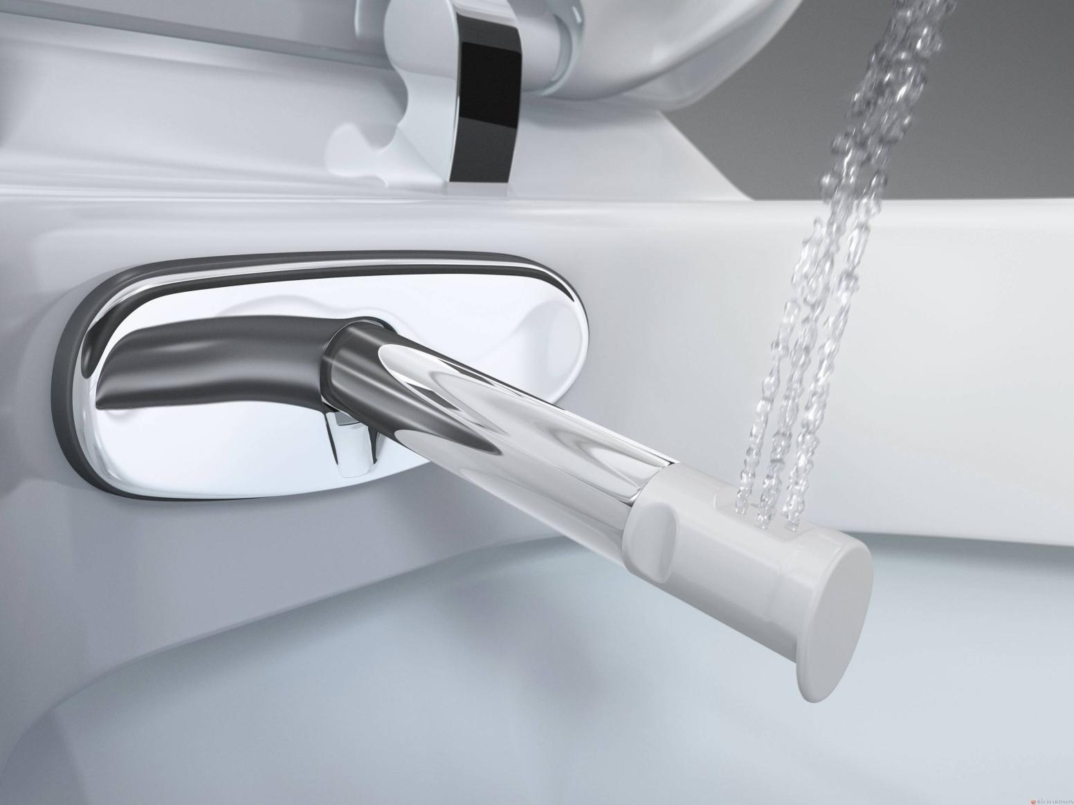 Nettoyage de la douchette avant et après chaque utilisation - Modèle Température de l'eau réglable - Comprenant : douchette mobile à jet oscillant et massant à intensité réglable et abattant avec frein de chute - Finition Blanc - Référence 146182111